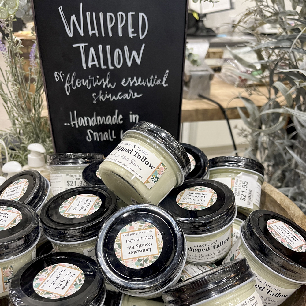 Whipped tallow lotions using the highest quality beef tallow, cold pressed olive oi and essential oils.