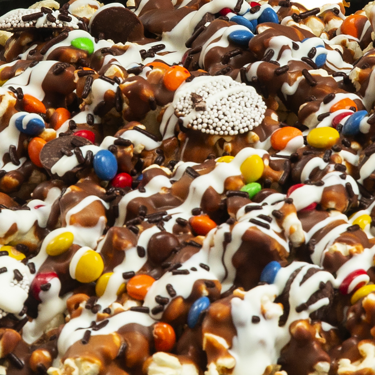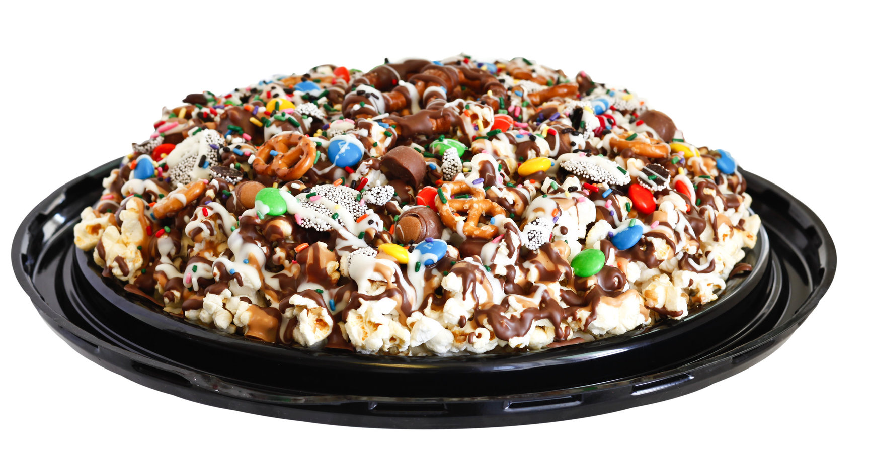 It’s Party Time! This 13 in.Party tray is layered with Sweet & Salty popcorn, drizzled with milk chocolate, and peanut butter chocolate, topped with theme colored assorted candies, and garnished with white chocolate and sprinkles. Try this for a unconventional birthday cake, hostess gift, teacher gift, office party and more! This product is gluten free.