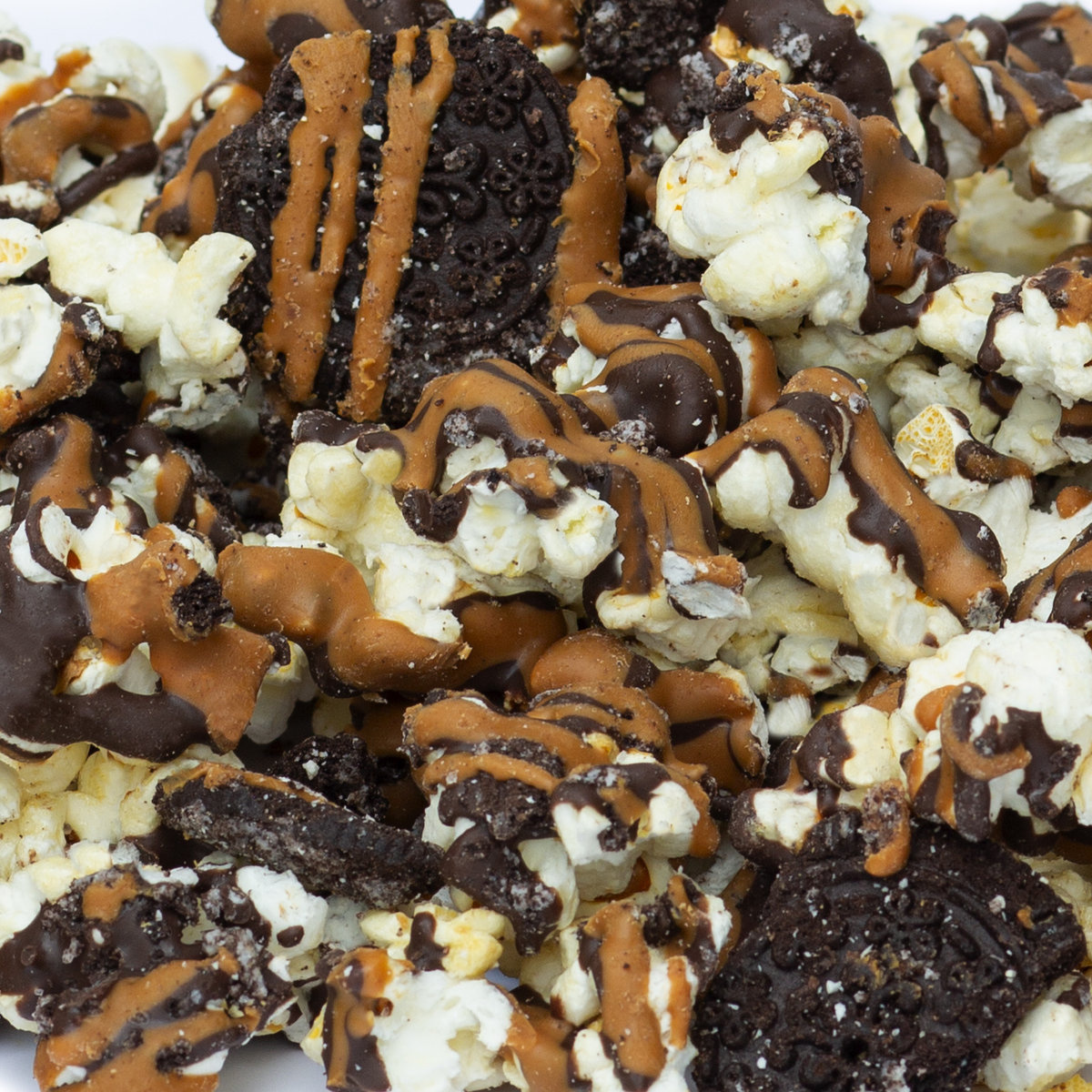 Non-GMO Popcorn, Coconut Oil, Sugar, Chocolate Wafers (Sugar, Palm Kernel and Palm Oils, Nonfat Dry Milk, Cocoa Processed With Alkali, Cocoa, Glyceryl Lacto Esters of Fatty Acids, Soy Lecithin, Partially Defatted Peanut Flour, Peanut Oil) Oreo cookies (Sugar, Enriched Flour (wheat flour, niacin, reduced iron, thiamin mononitrate ), riboflavin , folic acid), Soybean and Palm Oil with TBHQ for Freshness, Cocoa Processed with Alkali, Invert Sugar, Contains 2% or Less of Degerminated Yellow Corn Flour, Cornstarch, Chocolate, Salt, Leavening , Artificial Flavor, Soy Lecithin, Whey),sea salt.