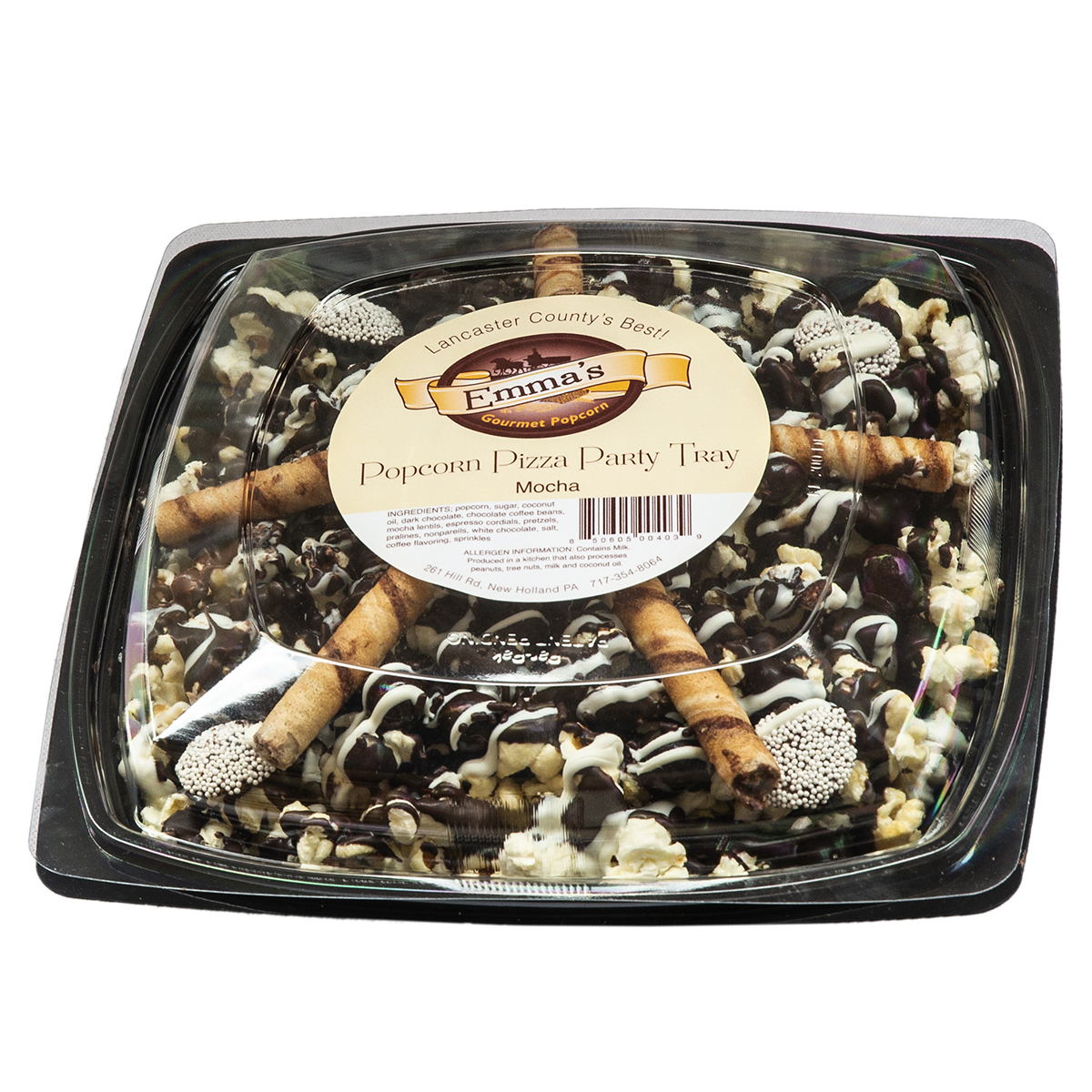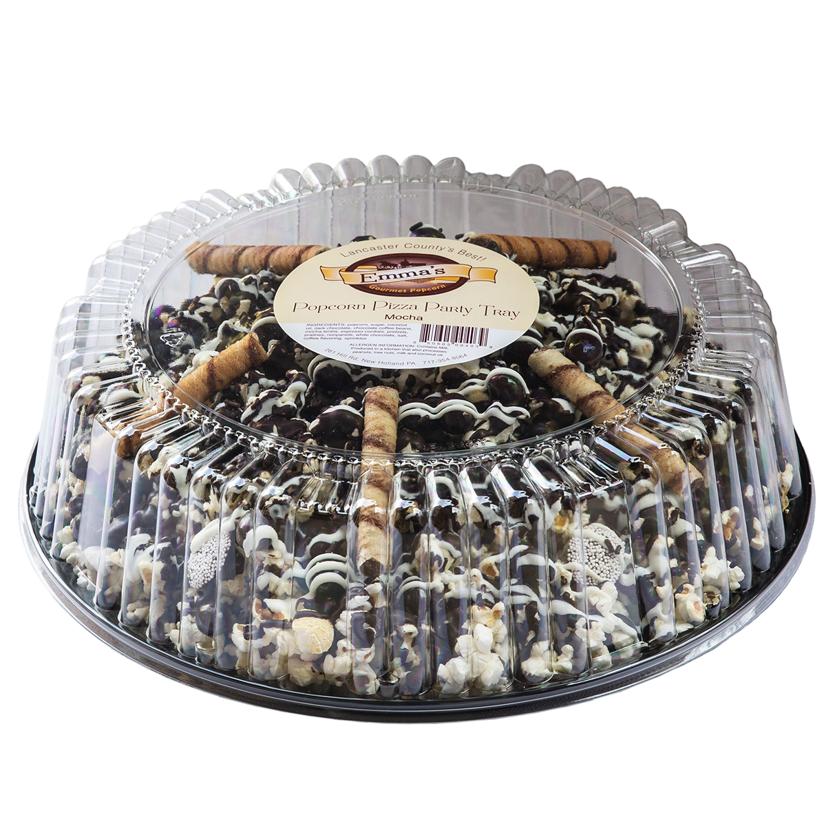 It’s Party Time! This 13 in.Party tray is filled with Sweet & Salty popcorn, drizzled with creamy coffee flavored dark chocolate, topped with choc. coffee beans, non-pareils, garnished with white chocolate and Pirouline creme filled wafers. Try this for a unconventional birthday cake, hostess gift, teacher gift, office party and more!