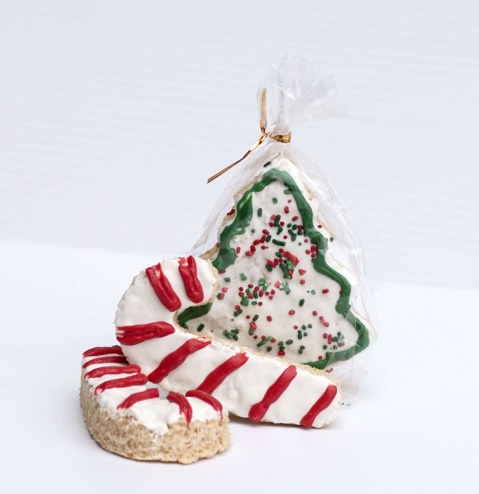 Homemade Rice Crispy Treats! Soft and chewy treats are topped with white or colored chocolate. Individually wrapped pieces. Delicious!